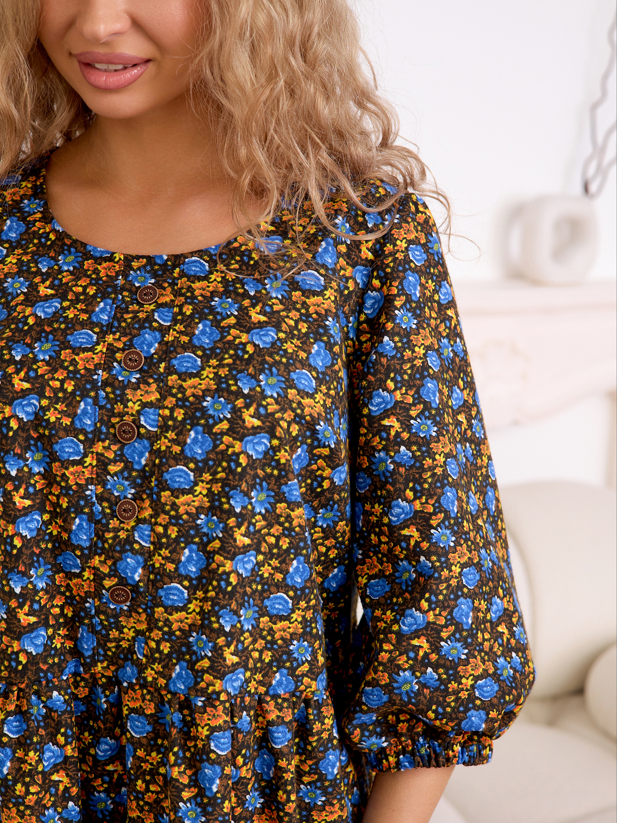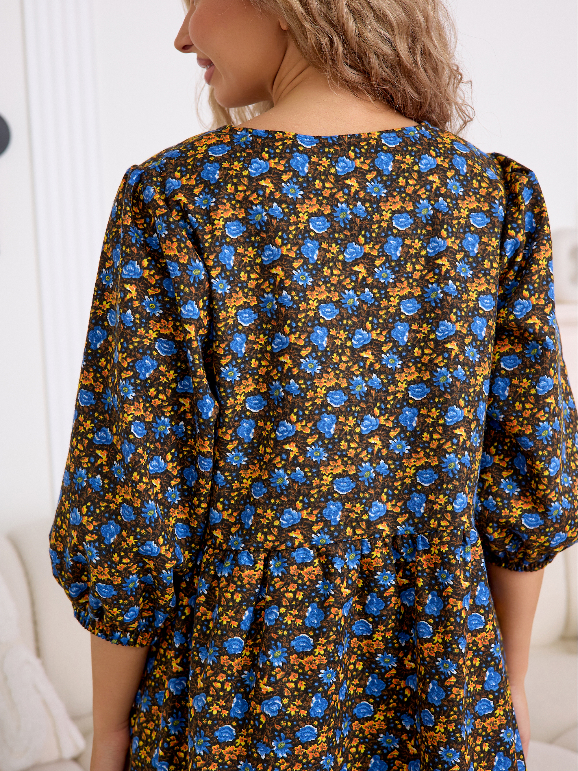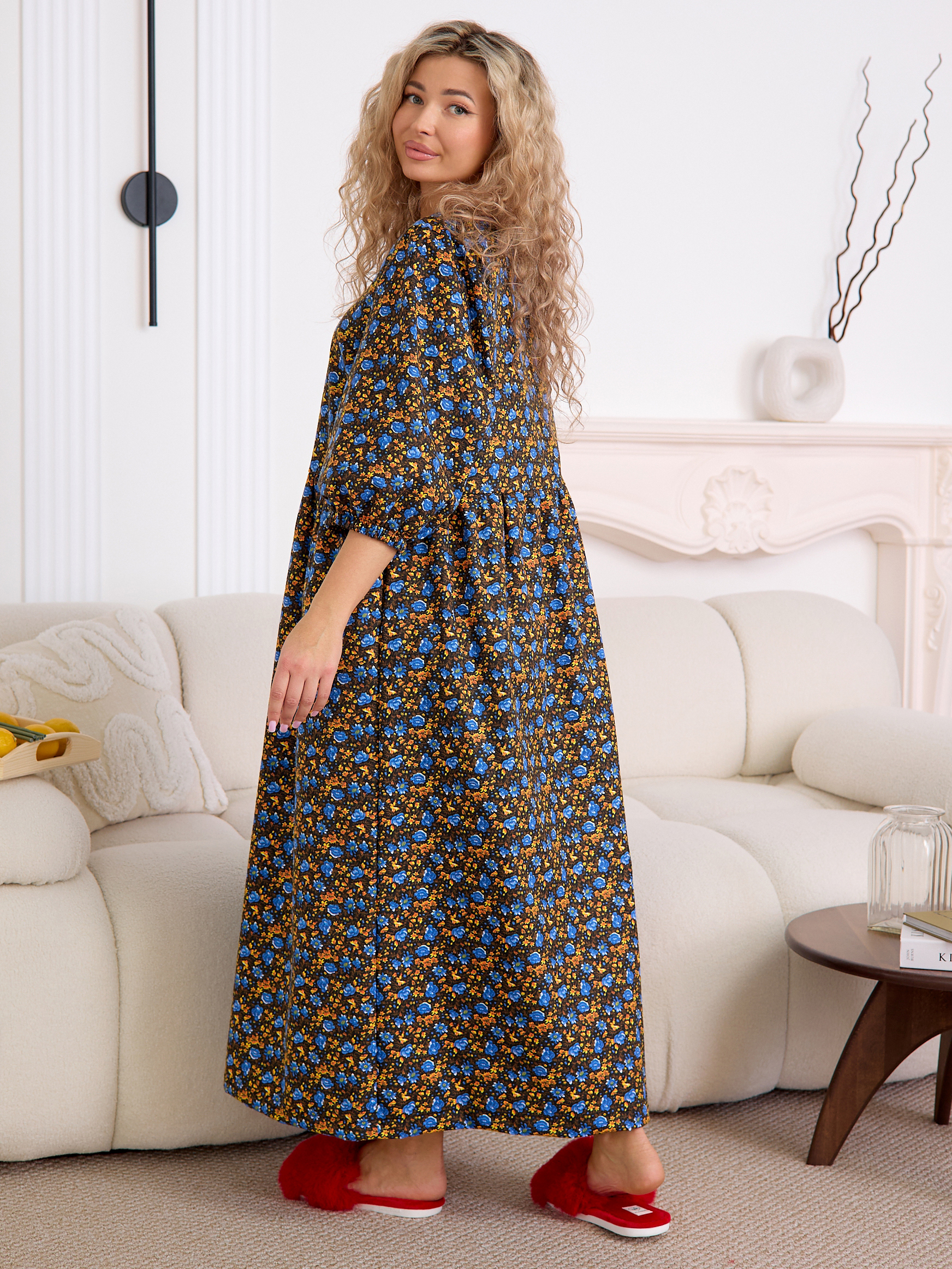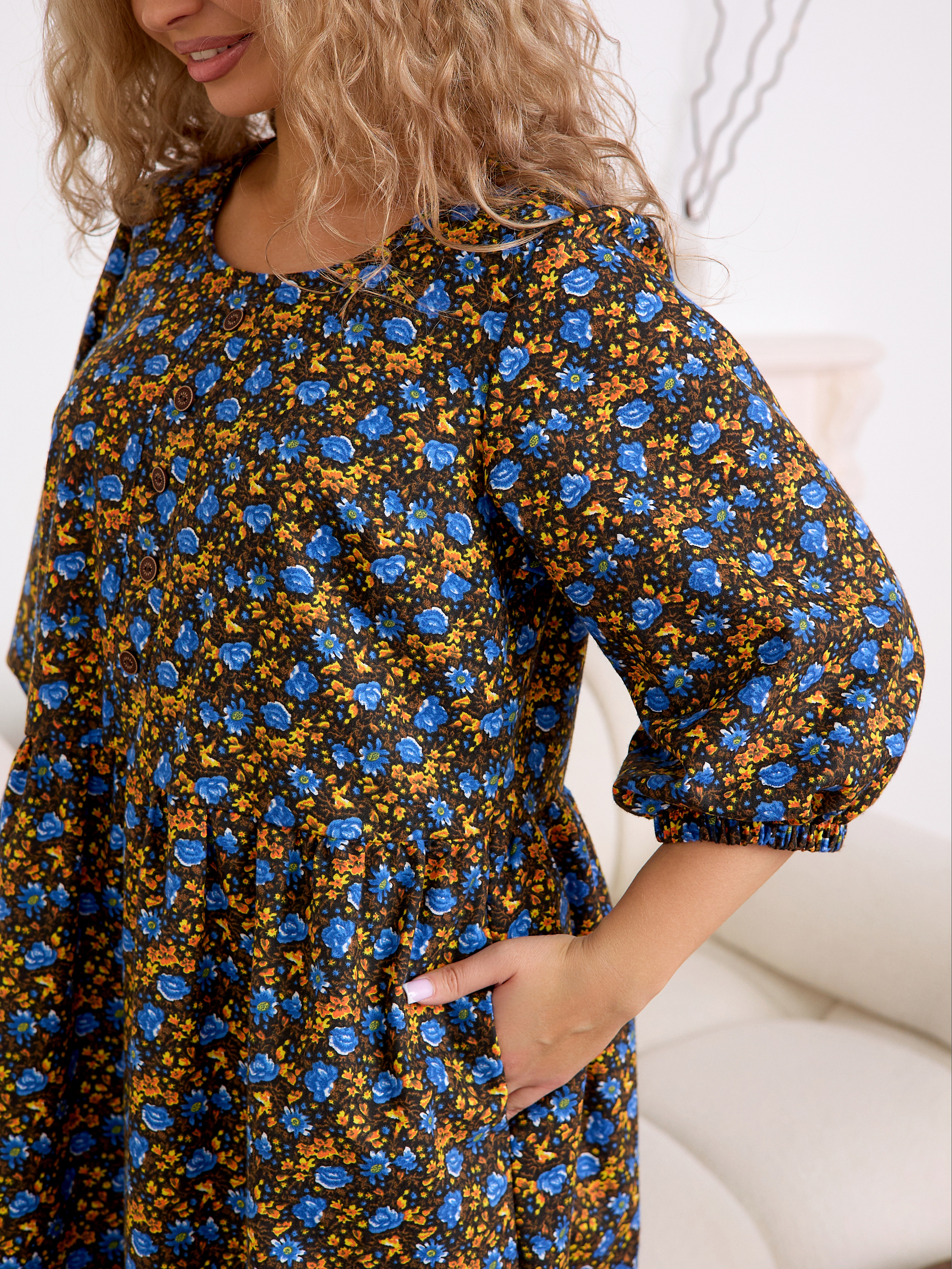 Рукав 3/4 с резинкой внизу — практичная и стильная деталь, которая завершает образ в духе «платья-крестьянки».